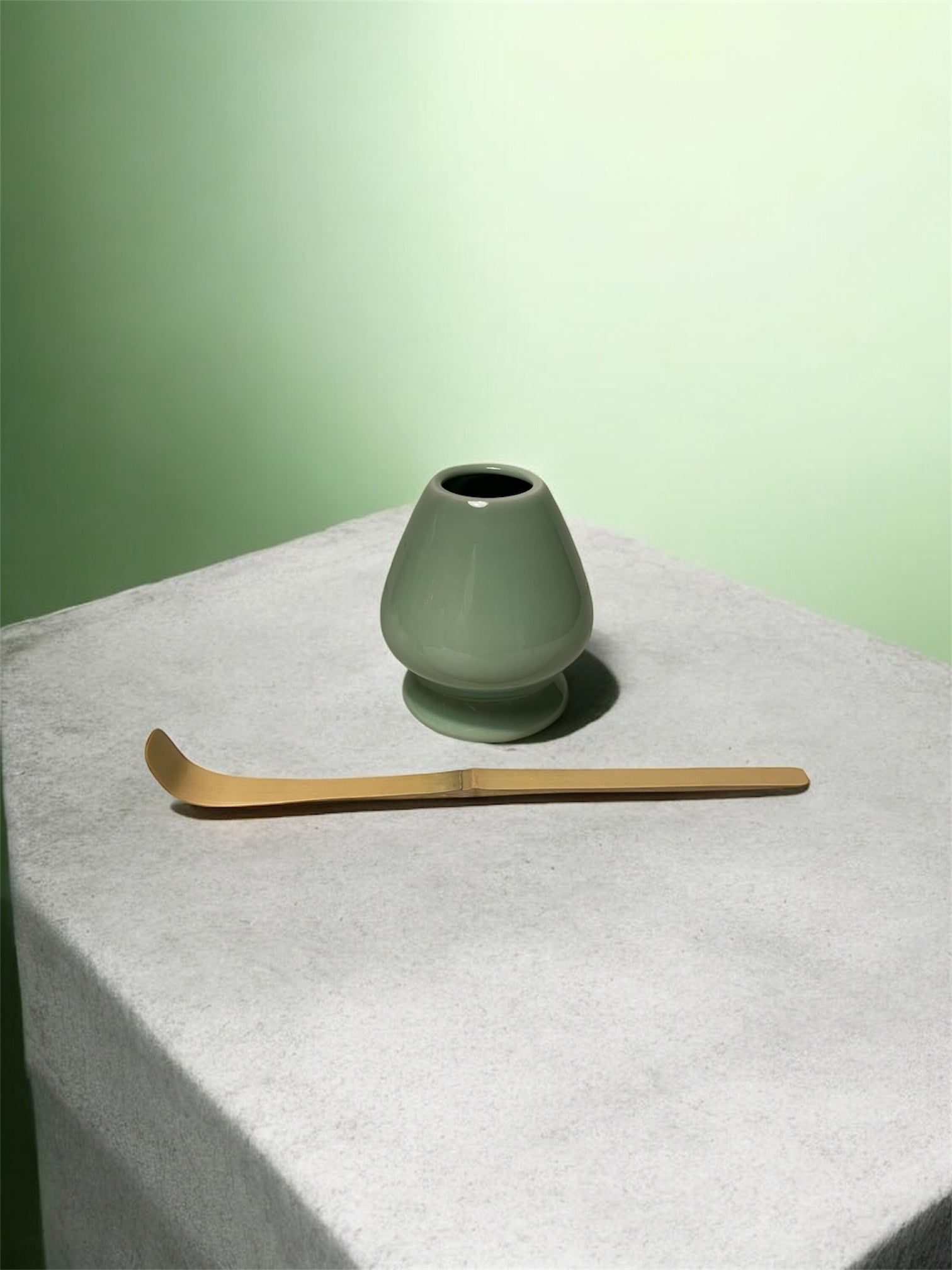 • Support de Fouet en Céramique : Une élégante pièce (ici de couleur vert clair) essentielle pour faire sécher votre Chasen, maintenir sa forme initiale et garantir sa durabilité.